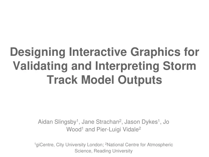 Designing Interactive Graphics for Validating and Interpreting Storm Track Model Outputs Aidan Slingsby 1 , Jane Strachan 2 , Jason Dykes 1 , Jo Wood 1 and Pier-Luigi Vidale 2 1 giCentre, City University London; 2 National Centre for Atmospheric Science, Reading University