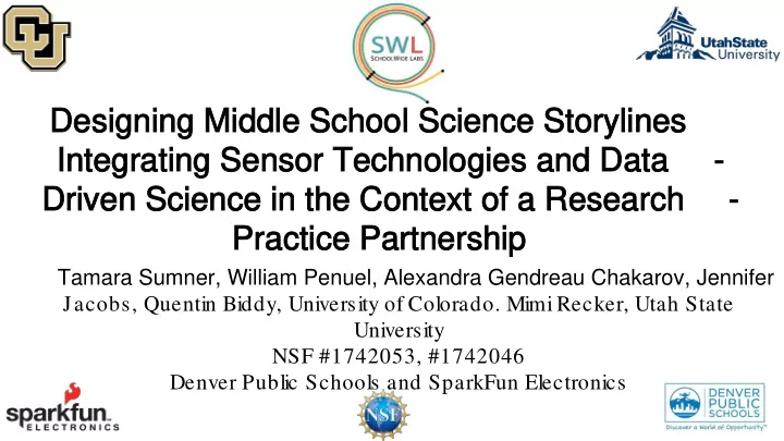 Designing Middle School Science Storylines Designing Middle School Science Storylines Integrating Sensor Technologies and Data Integrating Sensor Technologies and Data - Driven Science in the Context of a Research Driven Science in the Context of a Research - Practice Partnership Practice Partnership Tamara Sumner, William Penuel, Alexandra Gendreau Chakarov, Jennifer Jacobs, Quentin Biddy, University of Colorado. Mimi Recker, Utah State University NSF #1742053, #1742046 Denver Public Schools and SparkFun Electronics 1