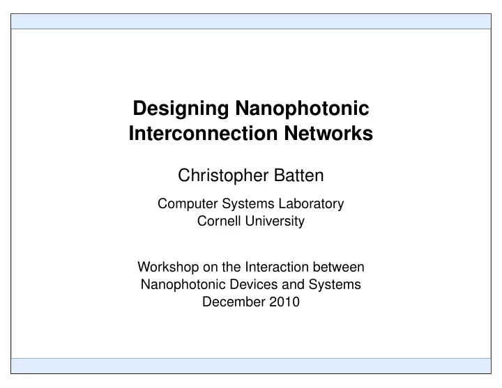 Designing Nanophotonic Interconnection Networks Christopher Batten Computer Systems Laboratory Cornell University Workshop on the Interaction between Nanophotonic Devices and Systems December 2010