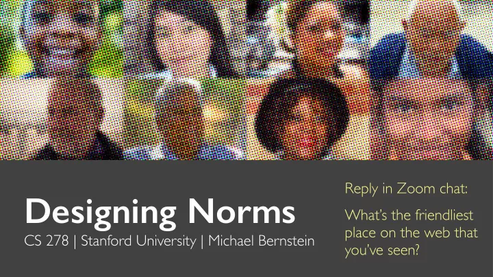 Reply in Zoom chat: Designing Norms What’s the friendliest place on the web that CS 278 | Stanford University | Michael Bernstein you’ve seen?