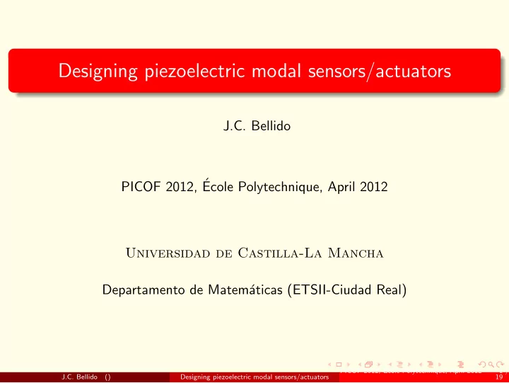 Designing piezoelectric modal sensors/actuators J.C. Bellido PICOF 2012, ´ Ecole Polytechnique, April 2012 Universidad de Castilla-La Mancha Departamento de Matem´ aticas (ETSII-Ciudad Real) PICOF 2012, ´ Ecole Polytechnique, April 2012 1 / J.C. Bellido () Designing piezoelectric modal sensors/actuators 19