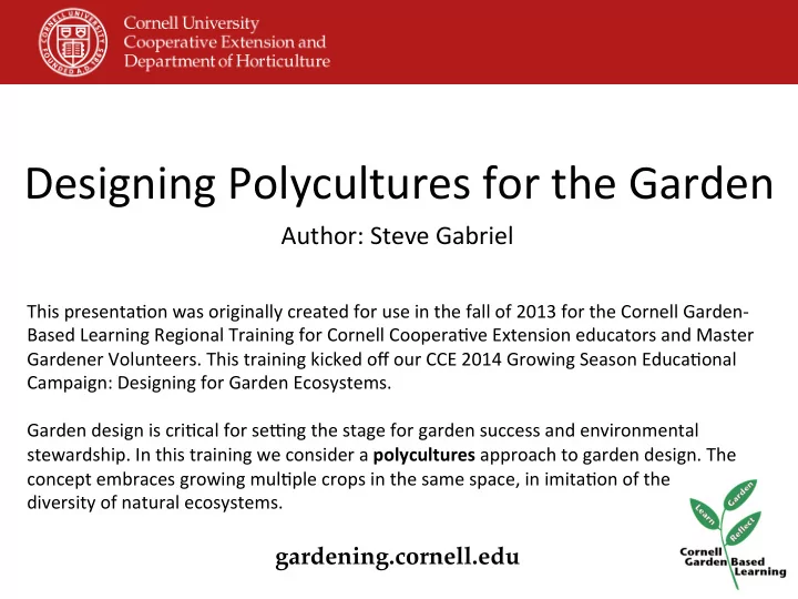 This ¡presenta7on ¡ Designing ¡Polycultures ¡for ¡the ¡Garden ¡ was ¡originally ¡created ¡by ¡Steve ¡Gabriel ¡for ¡use ¡in ¡the ¡fall ¡of ¡2013 ¡ for ¡the ¡Cornell ¡Garden-‑Based ¡Learning ¡Regional ¡Training ¡for ¡ Cornell ¡Coopera7ve ¡Extension ¡educators ¡and ¡Master ¡Gardener ¡ Volunteers. ¡This ¡training ¡kicked ¡off ¡our ¡CCE ¡2014 ¡Growing ¡Season ¡ Educa7onal ¡Campaign: ¡Designing ¡for ¡Garden ¡Ecosystems. ¡ gardening.cornell.edu �