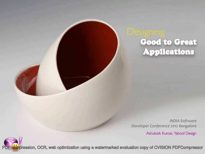 Designing ! !"#!$%&'()*+,-%% #-.-/'0-,%1'2(-,-23-%4564%7+28+/',-% Ash Ashutosh osh Kuma mar, Yahoo! oo! Desig esign ! PDF compression, OCR, web optimization using a watermarked evaluation copy of CVISION PDFCompressor PDF compression, OCR, web optimization using a watermarked evaluation copy of CVISION PDFCompressor
