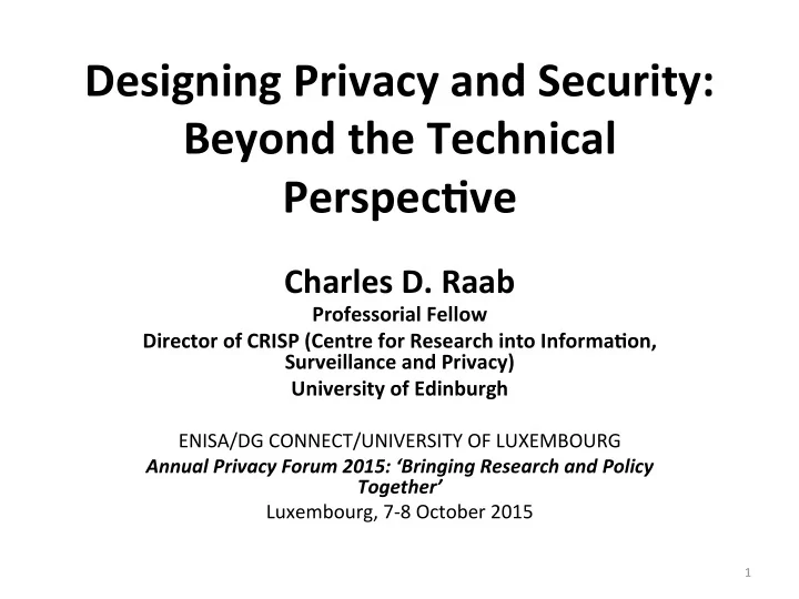 Designing ¡Privacy ¡and ¡Security: ¡ Beyond ¡the ¡Technical ¡ Perspec9ve ¡ ¡ Charles ¡D. ¡Raab ¡ Professorial ¡Fellow ¡ Director ¡of ¡CRISP ¡(Centre ¡for ¡Research ¡into ¡Informa9on, ¡ Surveillance ¡and ¡Privacy) ¡ University ¡of ¡Edinburgh ¡ ¡ ENISA/DG ¡CONNECT/UNIVERSITY ¡OF ¡LUXEMBOURG ¡ Annual ¡Privacy ¡Forum ¡2015: ¡‘Bringing ¡Research ¡and ¡Policy ¡ Together’ ¡ Luxembourg, ¡7-‑8 ¡October ¡2015 ¡ ¡ ¡ ¡ ¡ 1 ¡