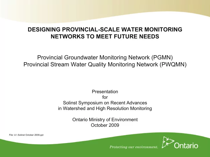 DESIGNING PROVINCIAL-SCALE WATER MONITORING NETWORKS TO MEET FUTURE NEEDS Provincial Groundwater Monitoring Network (PGMN) Provincial Stream Water Quality Monitoring Network (PWQMN) Presentation for Solinst Symposium on Recent Advances in Watershed and High Resolution Monitoring Ontario Ministry of Environment October 2009 File: U:\ Solinst October 2009.ppt