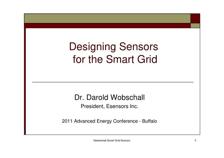Designing Sensors for the Smart Grid Dr. Darold Wobschall President, Esensors Inc. 2011 Advanced Energy Conference - Buffalo 1 Networked Smart Grid Sensors