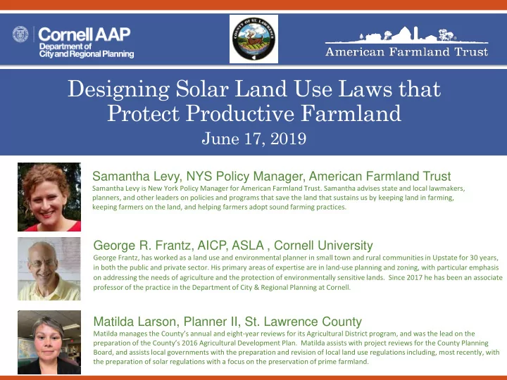 Designing Solar Land Use Laws that Protect Productive Farmland June 17, 2019 Samantha Levy, NYS Policy Manager, American Farmland Trust Samantha Levy is New York Policy Manager for American Farmland Trust. Samantha advises state and local lawmakers, planners, and other leaders on policies and programs that save the land that sustains us by keeping land in farming, keeping farmers on the land, and helping farmers adopt sound farming practices. George R. Frantz, AICP, ASLA , Cornell University George Frantz, has worked as a land use and environmental planner in small town and rural communities in Upstate for 30 years, in both the public and private sector. His primary areas of expertise are in land-use planning and zoning, with particular emphasis on addressing the needs of agriculture and the protection of environmentally sensitive lands. Since 2017 he has been an associate professor of the practice in the Department of City & Regional Planning at Cornell. Matilda Larson, Planner II, St. Lawrence County Matilda manages the County’s annual and eight-year reviews for its Agricultural District program, and was the lead on the preparation of the County’s 2016 Agricultural Development Plan. Matilda assists with project reviews for the County Planning Board, and assists local governments with the preparation and revision of local land use regulations including, most recently, with the preparation of solar regulations with a focus on the preservation of prime farmland.