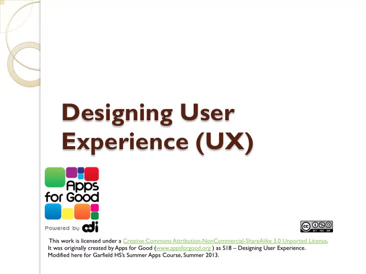 Designing User Experience (UX) This work is licensed under a Creative Commons Attribution-NonCommercial-ShareAlike 3.0 Unported License. It was originally created by Apps for Good (www.appsforgood.org ) as S18 – Designing User Experience. Modified here for Garfield HS’s Summer Apps Course, Summer 2013.