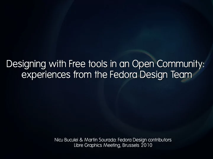 Designing with Free tools in an Open Community: Designing with Free tools in an Open Community: experiences from the Fedora Design Team experiences from the Fedora Design Team Nicu Buculei & Martin Sourada: Fedora Design contributors Nicu Buculei & Martin Sourada: Fedora Design contributors Libre Graphics Meeting, Brussels 2010 Libre Graphics Meeting, Brussels 2010