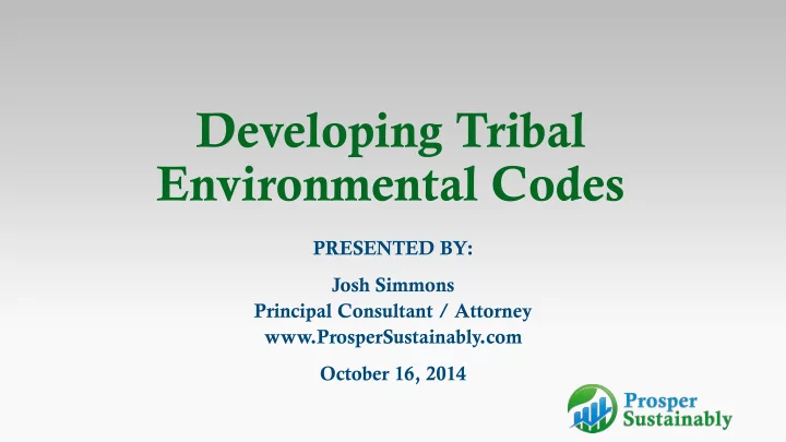 Developing Tribal Environmental Codes PRESENTED BY: Josh Simmons Principal Consultant / Attorney www.ProsperSustainably.com October 16, 2014