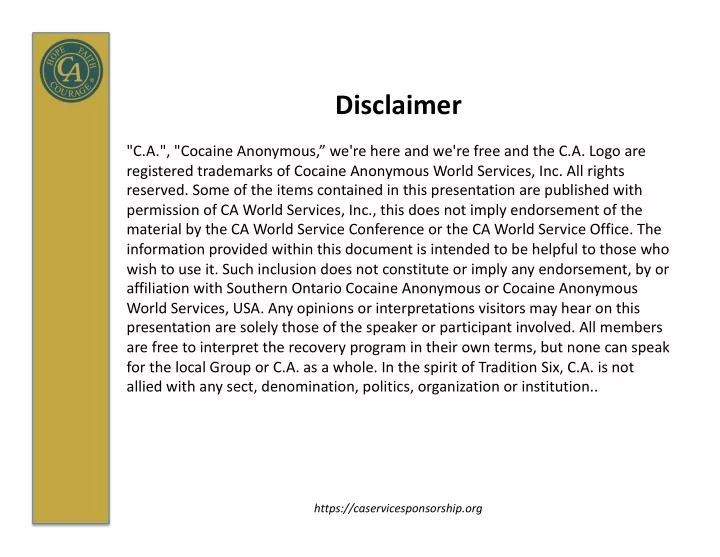 Disclaimer "C.A.", "Cocaine Anonymous,” we're here and we're free and the C.A. Logo are registered trademarks of Cocaine Anonymous World Services, Inc. All rights reserved. Some of the items contained in this presentation are published with permission of CA World Services, Inc., this does not imply endorsement of the material by the CA World Service Conference or the CA World Service Office. The information provided within this document is intended to be helpful to those who wish to use it. Such inclusion does not constitute or imply any endorsement, by or affiliation with Southern Ontario Cocaine Anonymous or Cocaine Anonymous World Services, USA. Any opinions or interpretations visitors may hear on this presentation are solely those of the speaker or participant involved. All members are free to interpret the recovery program in their own terms, but none can speak for the local Group or C.A. as a whole. In the spirit of Tradition Six, C.A. is not allied with any sect, denomination, politics, organization or institution.. https://caservicesponsorship.org
