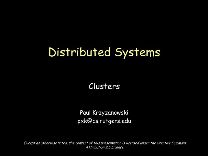 Distributed Systems Clusters Paul Krzyzanowski pxk@cs.rutgers.edu Except as otherwise noted, the content of this presentation is licensed under the Creative Commons Attribution 2.5 License.