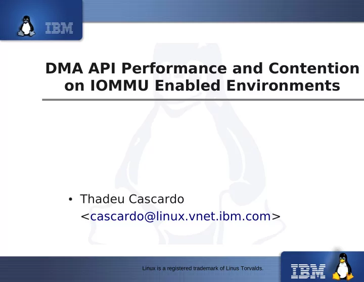 DMA API Performance and Contention on IOMMU Enabled Environments ● Thadeu Cascardo <cascardo@linux.vnet.ibm.com> Linux is a registered trademark of Linus Torvalds.
