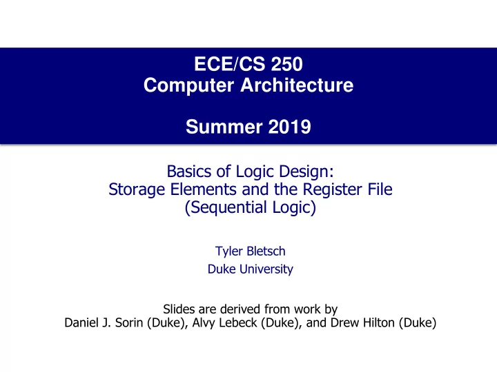 ECE/CS 250 Computer Architecture Summer 2019 Basics of Logic Design: Storage Elements and the Register File (Sequential Logic) Tyler Bletsch Duke University Slides are derived from work by Daniel J. Sorin (Duke), Alvy Lebeck (Duke), and Drew Hilton (Duke)