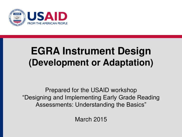 EGRA Instrument Design (Development or Adaptation) Prepared for the USAID workshop “Designing and Implementing Early Grade Reading Assessments: Understanding the Basics” March 2015