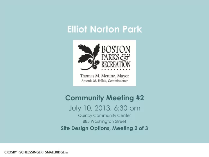 Elliot Norton Park Community Meeting #2 July 10, 2013, 6:30 pm Quincy Community Center 885 Washington Street Site Design Options, Meeting 2 of 3