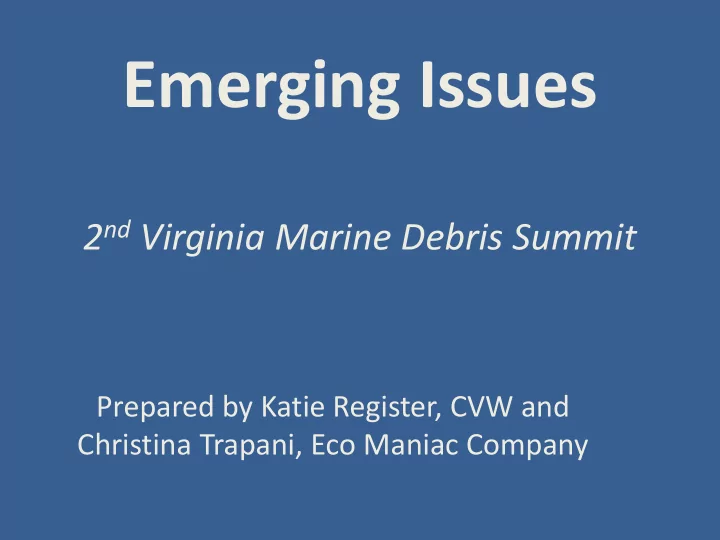 Emerging Issues 2 nd Virginia Marine Debris Summit Prepared by Katie Register, CVW and Christina Trapani, Eco Maniac Company