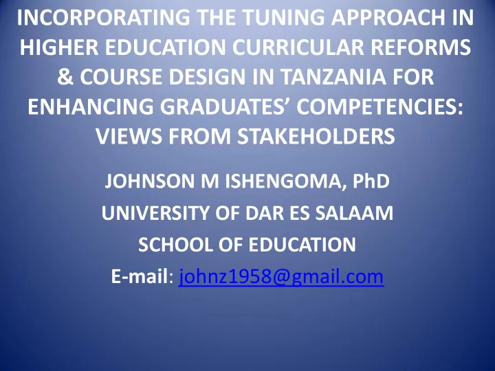 INCORPORATING THE TUNING APPROACH IN HIGHER EDUCATION CURRICULAR REFORMS & COURSE DESIGN IN TANZANIA FOR ENHANCING GRADUATES’ COMPETENCIES: VIEWS FROM STAKEHOLDERS JOHNSON M ISHENGOMA, PhD UNIVERSITY OF DAR ES SALAAM SCHOOL OF EDUCATION E-mail : johnz1958@gmail.com