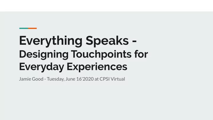 Everything Speaks - Designing Touchpoints for Everyday Experiences Jamie Good - Tuesday, June 16’2020 at CPSI Virtual