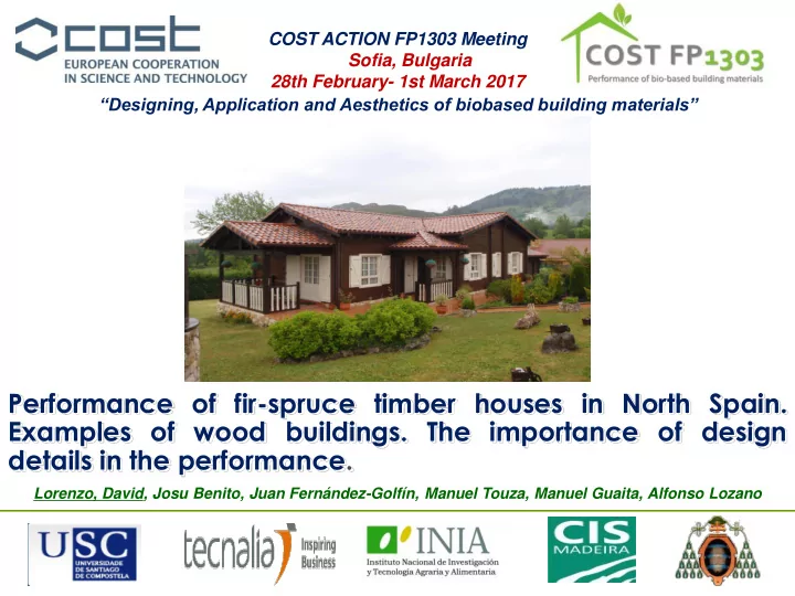 COST ACTION FP1303 Meeting Sofia, Bulgaria 28th February- 1st March 2017 “Designing, Application and Aesthetics of biobased building materials” Performance of fir-spruce timber houses in North Spain. Examples of wood buildings. The importance of design details in the performance. Lorenzo, David, Josu Benito, Juan Fernández-Golfín, Manuel Touza, Manuel Guaita, Alfonso Lozano