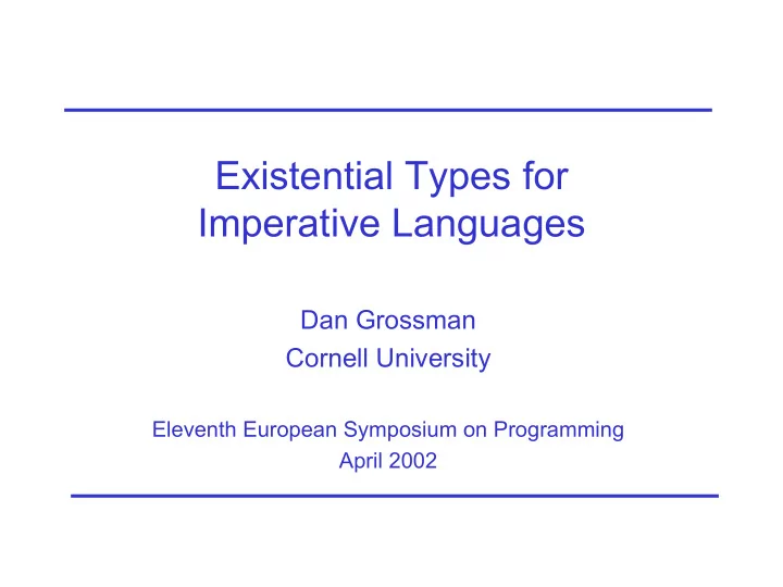Existential Types for Imperative Languages Dan Grossman Cornell University Eleventh European Symposium on Programming April 2002