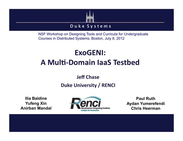 D D u k e S y s t t e m s NSF Workshop on Designing Tools and Curricula for Undergraduate Courses in Distributed Systems, Boston, July 8, 2012 ExoGENI: ¡ A ¡Mul--‑Domain ¡IaaS ¡Testbed ¡ Jeff ¡Chase ¡ Duke ¡University ¡/ ¡RENCI ¡ Ilia Baldine Paul Ruth Yufeng Xin Aydan Yumerefendi Anirban Mandal Chris Heerman