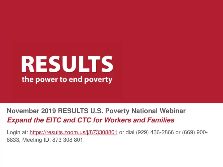 November 2019 RESULTS U.S. Poverty National Webinar Expand the EITC and CTC for Workers and Families Login at: https://results.zoom.us/j/873308801 or dial (929) 436-2866 or (669) 900- 6833, Meeting ID: 873 308 801.