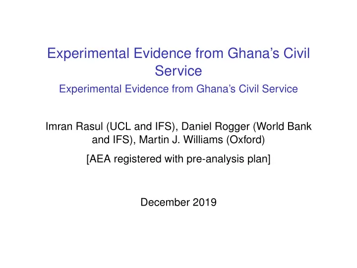 Experimental Evidence from Ghana’s Civil Service Experimental Evidence from Ghana’s Civil Service Imran Rasul (UCL and IFS), Daniel Rogger (World Bank and IFS), Martin J. Williams (Oxford) [AEA registered with pre-analysis plan] December 2019
