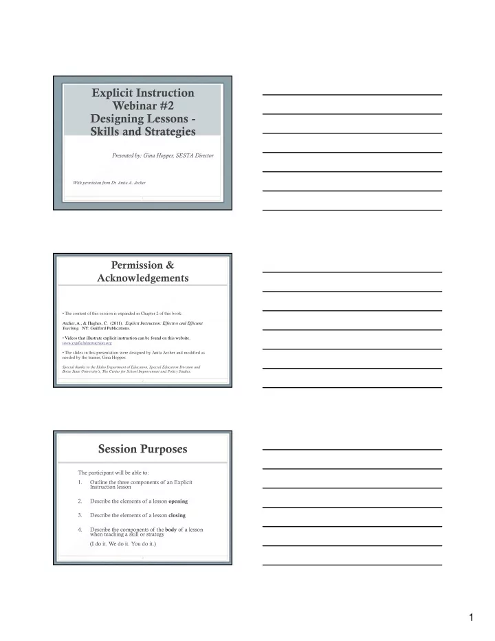 Explicit Instruction Webinar #2 Designing Lessons - Skills and Strategies Presented by: Gina Hopper, SESTA Director With permission from Dr. Anita A. Archer 1 Permission & Acknowledgements • The content of this session is expanded in Chapter 2 of this book: Archer, A., & Hughes, C. (2011). Explicit Instruction: Effective and Efficient Teaching. NY: Guilford Publications. • Videos that illustrate explicit instruction can be found on this website. www.explicitinstruction.org • The slides in this presentation were designed by Anita Archer and modified as needed by the trainer, Gina Hopper. Special thanks to the Idaho Department of Education, Special Education Division and Boise State University’s, The Center for School Improvement and Policy Studies. 2 Session Purposes The participant will be able to: 1. Outline the three components of an Explicit Instruction lesson 2. Describe the elements of a lesson opening 3. Describe the elements of a lesson closing 4. Describe the components of the body of a lesson when teaching a skill or strategy (I do it. We do it. You do it.) 3 1