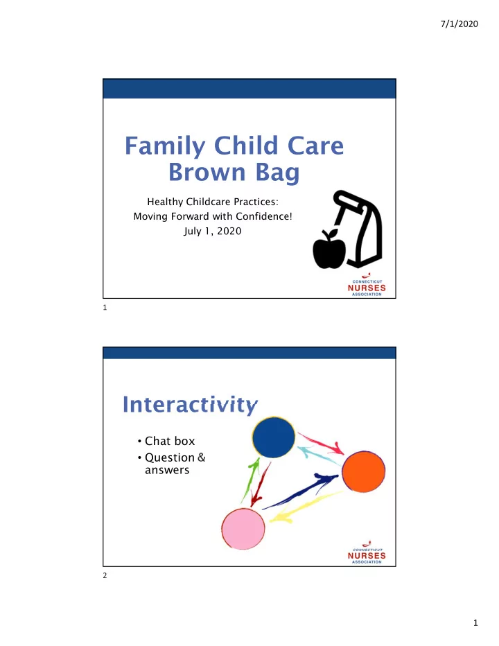 7/1/2020 Family Child Care Brown Bag Healthy Childcare Practices: Moving Forward with Confidence! July 1, 2020 1 Interactivity • Chat box • Question & answers 2 1