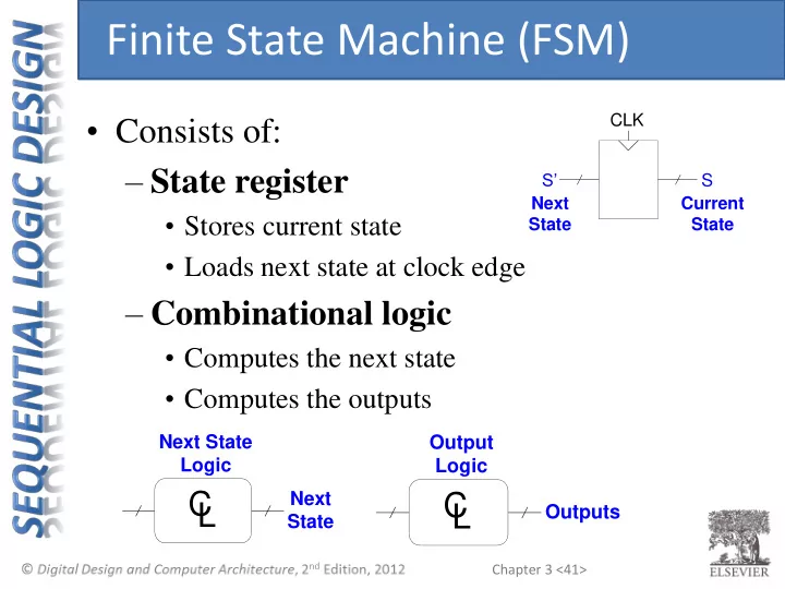 Finite State Machine (FSM) • Consists of: CLK – State register S’ S Next Current • Stores current state State State • Loads next state at clock edge – Combinational logic • Computes the next state • Computes the outputs Next State Output Logic Logic C Next C L L Outputs State Chapter 3 <41>