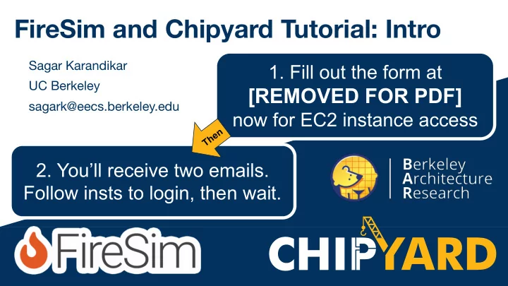 FireSim and Chipyard Tutorial: Intro Sagar Karandikar 1. Fill out the form at UC Berkeley [REMOVED FOR PDF] sagark@eecs.berkeley.edu now for EC2 instance access Then 2. You’ll receive two emails. Follow insts to login, then wait.