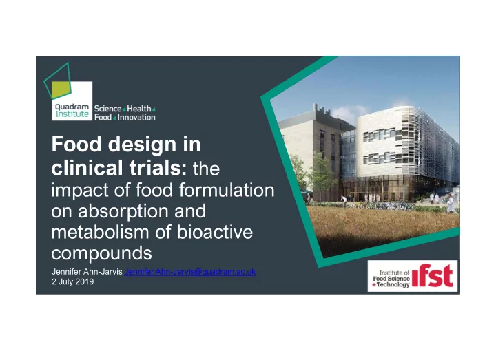 Food design in clinical trials: the impact of food formulation on absorption and metabolism of bioactive compounds Jennifer Ahn-Jarvis Jennifer.Ahn-Jarvis@quadram.ac.uk 2 July 2019