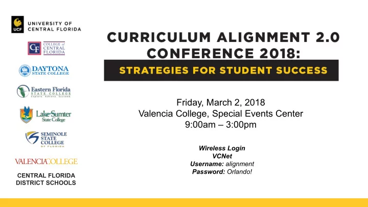 Friday, March 2, 2018 Valencia College, Special Events Center 9:00am – 3:00pm Wireless Login VCNet Username: alignment Password: Orlando! CENTRAL FLORIDA DISTRICT SCHOOLS