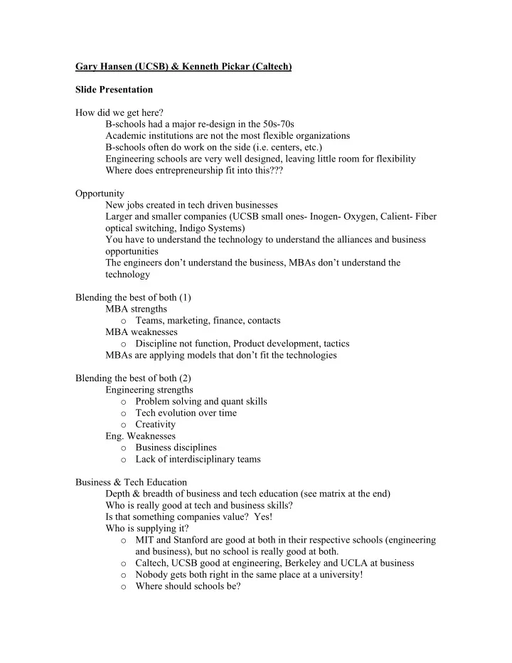 Gary Hansen (UCSB) & Kenneth Pickar (Caltech) Slide Presentation How did we get here? B-schools had a major re-design in the 50s-70s • Academic institutions are not the most flexible organizations • B-schools often do work on the side (i.e. centers, etc.) • Engineering schools are very well designed, leaving little room for flexibility • Where does entrepreneurship fit into this??? • Opportunity New jobs created in tech driven businesses • Larger and smaller companies (UCSB small ones- Inogen- Oxygen, Calient- Fiber • optical switching, Indigo Systems) You have to understand the technology to understand the alliances and business • opportunities The engineers don’t understand the business, MBAs don’t understand the • technology Blending the best of both (1) MBA strengths • o Teams, marketing, finance, contacts MBA weaknesses • o Discipline not function, Product development, tactics MBAs are applying models that don’t fit the technologies • Blending the best of both (2) Engineering strengths • o Problem solving and quant skills o Tech evolution over time o Creativity Eng. Weaknesses • o Business disciplines o Lack of interdisciplinary teams Business & Tech Education Depth & breadth of business and tech education (see matrix at the end) • Who is really good at tech and business skills? • Is that something companies value? Yes! • Who is supplying it? • o MIT and Stanford are good at both in their respective schools (engineering and business), but no school is really good at both. o Caltech, UCSB good at engineering, Berkeley and UCLA at business o Nobody gets both right in the same place at a university! o Where should schools be?