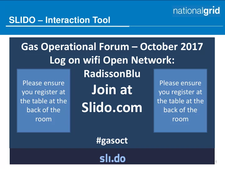 SLIDO – Interaction Tool Gas Operational Forum – October 2017 Log on wifi Open Network: RadissonBlu Please ensure Please ensure Join at you register at you register at the table at the the table at the Slido.com back of the back of the room room #gasoct 1