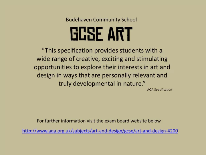 Budehaven Community School GCSE ART “This specification provides students with a wide range of creative, exciting and stimulating opportunities to explore their interests in art and design in ways that are personally relevant and truly developmental in nature.” AQA Specification For further information visit the exam board website below http://www.aqa.org.uk/subjects/art-and-design/gcse/art-and-design-4200
