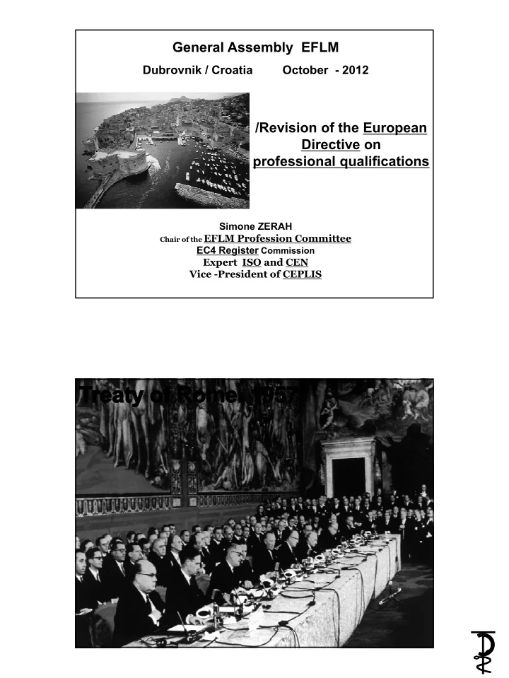 General Assembly EFLM Dubrovnik / Croatia October - 2012 /Revision of the European Directive on professional qualifications Simone ZERAH Chair of the EFLM Profession Committee EC4 Register Commission Expert ISO and CEN Vice -President of CEPLIS LABORATOIRE ZTP