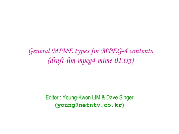 General MIME types for MPEG-4 contents (draft-lim-mpeg4-mime-01.txt) Editor : Young-Kwon LIM & Dave Singer (young@netntv.co.kr)