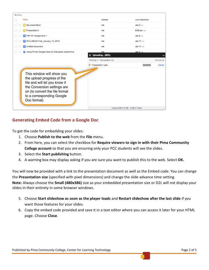 Generating Embed Code from a Google Doc To get the code for embedding your slides: 1. Choose Publish to the web from the File menu. 2. From here, you can select the checkbox for Require viewers to sign in with their Pima Community College account so that you are ensuring only your PCC students will see the slides. 3. Select the Start publishing button. 4. A warning box may display asking if you are sure you want to publish this to the web. Select OK. You will now be provided with a link to the presentation document as well as the Embed code. You can change the Presentation size (specified with pixel dimensions) and change the slide advance time setting. Note: Always choose the Small (480x386) size as your embedded presentation size or D2L will not display your slides in their entirety in some browser windows. 5. Choose Start slideshow as soon as the player loads and Restart slideshow after the last slide if you want those features for your slides. 6. Copy the embed code provided and save it in a text editor where you can access it later for your HTML page. Choose Close . Published by Pima Community College, Center for Learning Technology Page 2 of 5