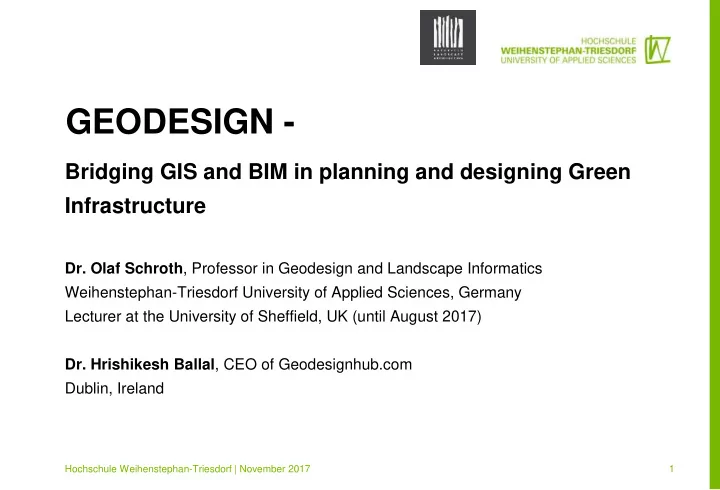 GEODESIGN - Bridging GIS and BIM in planning and designing Green Infrastructure Dr. Olaf Schroth , Professor in Geodesign and Landscape Informatics Weihenstephan-Triesdorf University of Applied Sciences, Germany Lecturer at the University of Sheffield, UK (until August 2017) Dr. Hrishikesh Ballal , CEO of Geodesignhub.com Dublin, Ireland Mitglied im Hochschule Weihenstephan-Triesdorf | November 2017 1