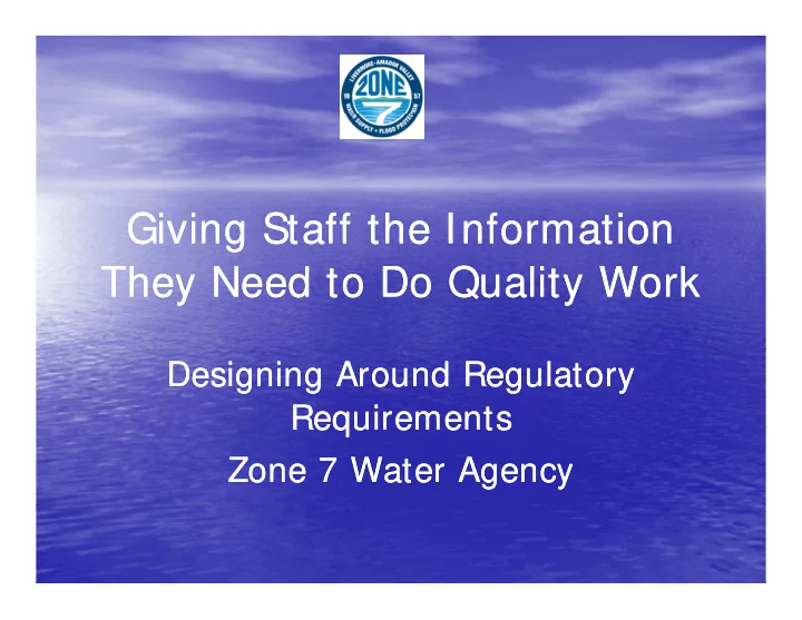 Giving Staff the Information Giving Staff the Information Th They Need to Do Quality Work They Need to Do Quality Work Th N N d t d t D D Q Q lit lit W W k k Designing Around Regulatory Designing Around Regulatory Requirements Requirements Requirements Requirements Zone 7 Water Agency Zone 7 Water Agency