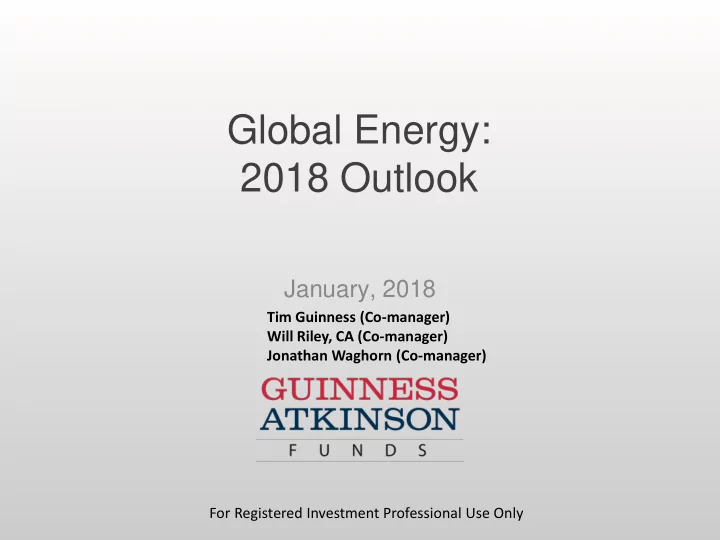 Global Energy: 2018 Outlook January, 2018 Tim Guinness (Co-manager) Will Riley, CA (Co-manager) Jonathan Waghorn (Co-manager) For Registered Investment Professional Use Only