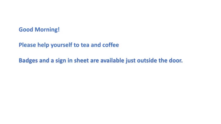 Good Morning! Please help yourself to tea and coffee Badges and a sign in sheet are available just outside the door.