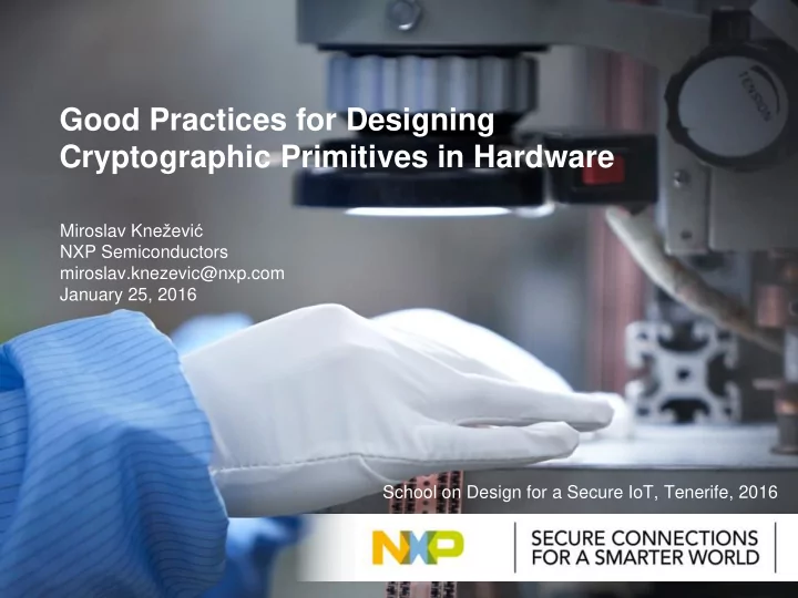 Good Practices for Designing Cryptographic Primitives in Hardware Miroslav Kne ž evi ć NXP Semiconductors miroslav.knezevic@nxp.com January 25, 2016 School on Design for a Secure IoT, Tenerife, 2016