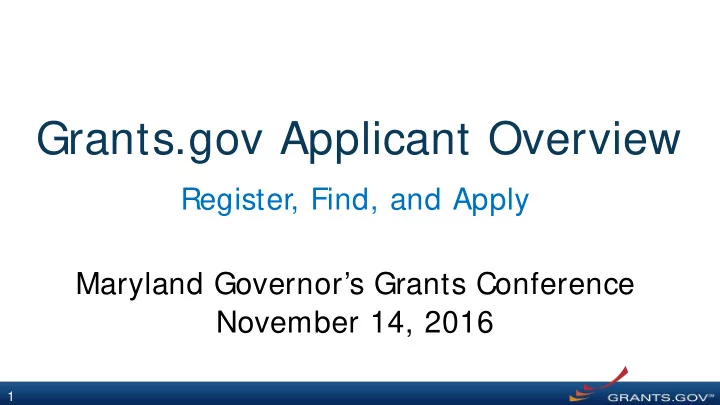 Grants.gov Applicant Overview Register, Find, and Apply Maryland Governor’s Grants Conference November 14, 2016 1