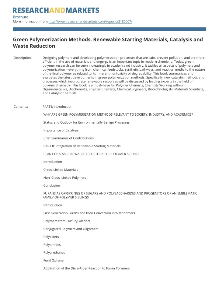LC Copolymers for Photofunctional Polymers LC Copolymers for High Heat–Resistant Polymers Conclusion ENZYMATIC POLYMER SYNTHESIS IN GREEN CHEMISTRY Introduction Polymers Green Media for Enzymatic Polymerization Conclusions and Outlook GREEN CATIONIC POLYMERIZATIONS AND POLYMER FUNCTIONALIZATION FOR BIOTECHNOLOGY Introduction Enzyme Catalysis "Green" Cationic Polymerizations and Polymer Functionalization Using Lipases Natural Rubber Biosynthesis – The Ultimate Green Cationic Polymerization Green Synthetic Cationic Polymerization and Copolymerization of Isoprene Ordering: Order Online - http://www.researchandmarkets.com/reports/2180007/ Order by Fax - using the form below Order by Post - print the order form below and send to Research and Markets, Guinness Centre, Taylors Lane, Dublin 8, Ireland.
