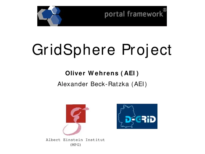 GridSphere Project Oliver W ehrens ( AEI ) Alexander Beck-Ratzka (AEI) Albert Einstein Institut (MPG)
