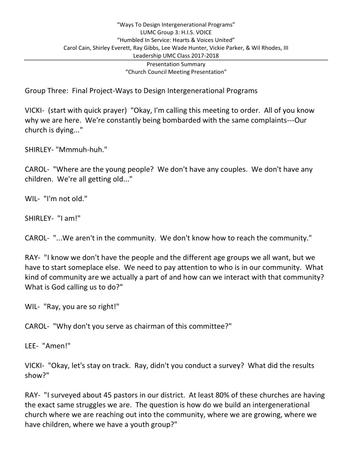 “Ways To Design Intergenerational Programs” LUMC Group 3: H.I.S. VOICE “Humbled In Service: Hearts & Voices United” Carol Cain, Shirley Everett, Ray Gibbs, Lee Wade Hunter, Vickie Parker, & Wil Rhodes, III Leadership UMC Class 2017-2018 Presentation Summary “ Church Council Meeting Presentation ” VICKI- "Well, we certainly have a lot to pray about. Wil, would you please close us in prayer?" WIL- (quick prayer)
