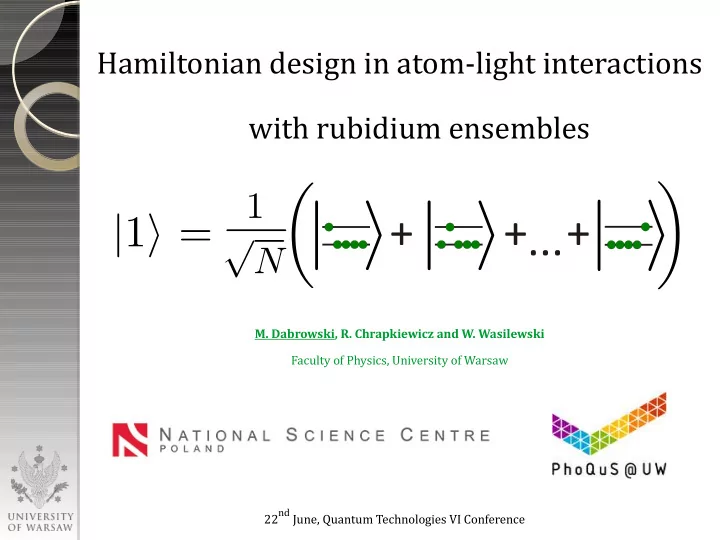 Hamiltonian design in atom-light interactions with rubidium ensembles M. Dabrowski, R. Chrapkiewicz and W. Wasilewski Faculty of Physics, University of Warsaw 22 nd June, Quantum Technologies VI Conference